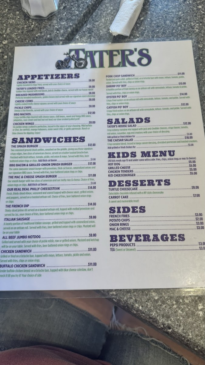 Welcome to Tater's Place, an inviting eatery located in the heart of Paris, TN. This vibrant spot combines a unique atmosphere and a delectable menu offering a feast for both the eyes and palate. As you step inside, you’ll be greeted by impressive motorcycle displays and an ambiance filled with lively music.